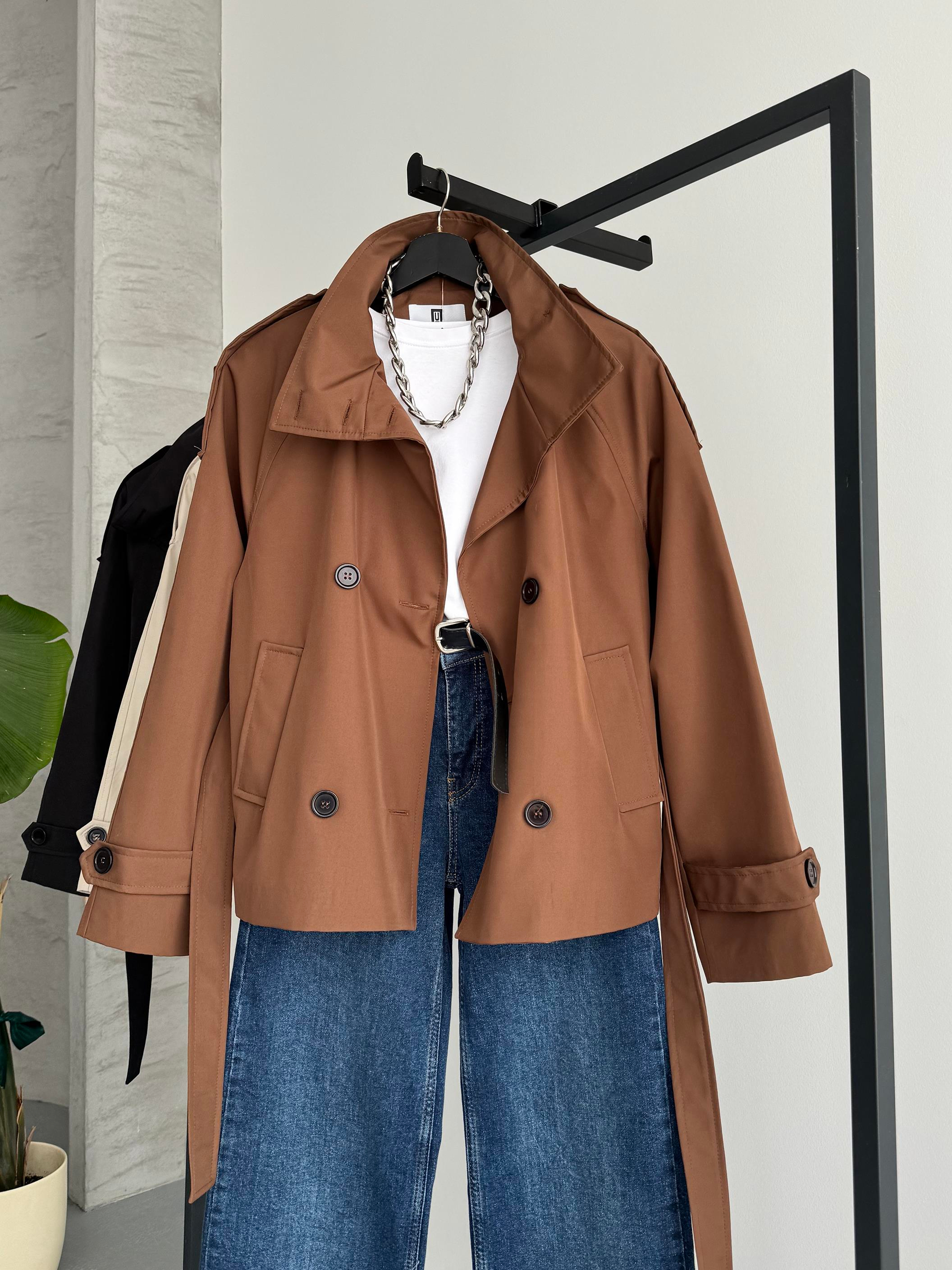 Zamansız şıklığın anahtarı: Kısa Kahverengi trençkot! Modern şehir hayatına ayak uyduracak şekilde tasarlanan bu oversize fit trençkot, klasik detaylarıyla dikkat çekiyor. Omuz apoletleri, çift düğmeli önü ve bele oturan kemeriyle hem işlevsel hem de stil sahibi bir dış giyim alternatifi sunuyor.