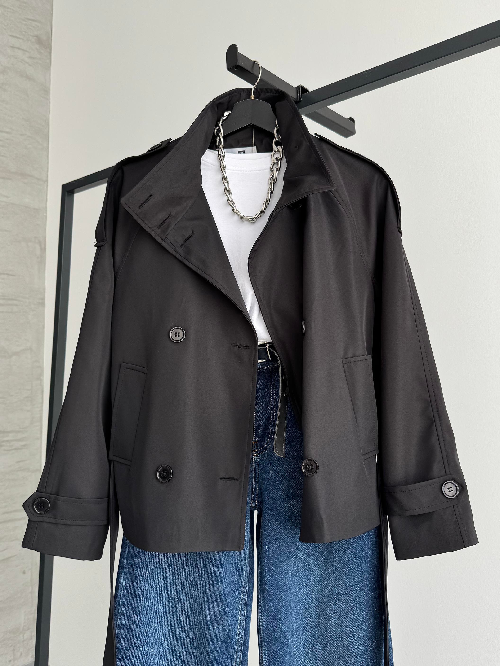 Zamansız şıklığın anahtarı: Kısa Siyah trençkot! Modern şehir hayatına ayak uyduracak şekilde tasarlanan bu oversize fit trençkot, klasik detaylarıyla dikkat çekiyor. Omuz apoletleri, çift düğmeli önü ve bele oturan kemeriyle hem işlevsel hem de stil sahibi bir dış giyim alternatifi sunuyor.