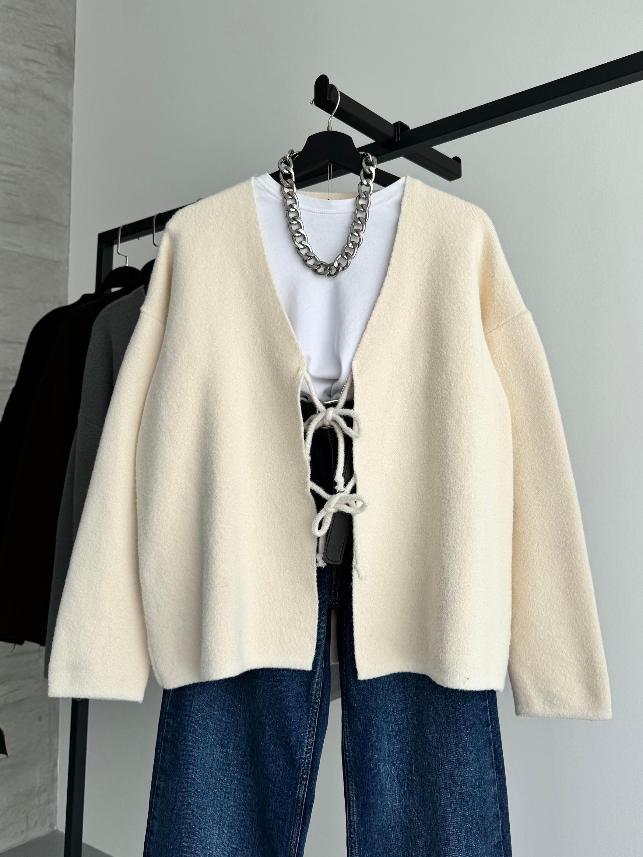 Ürün Detayları: Önden bağlamalı, oversize kesim. Yumuşak dokulu triko karışımlı kumaş. Hafif ve rahat kullanım. Düğmesiz