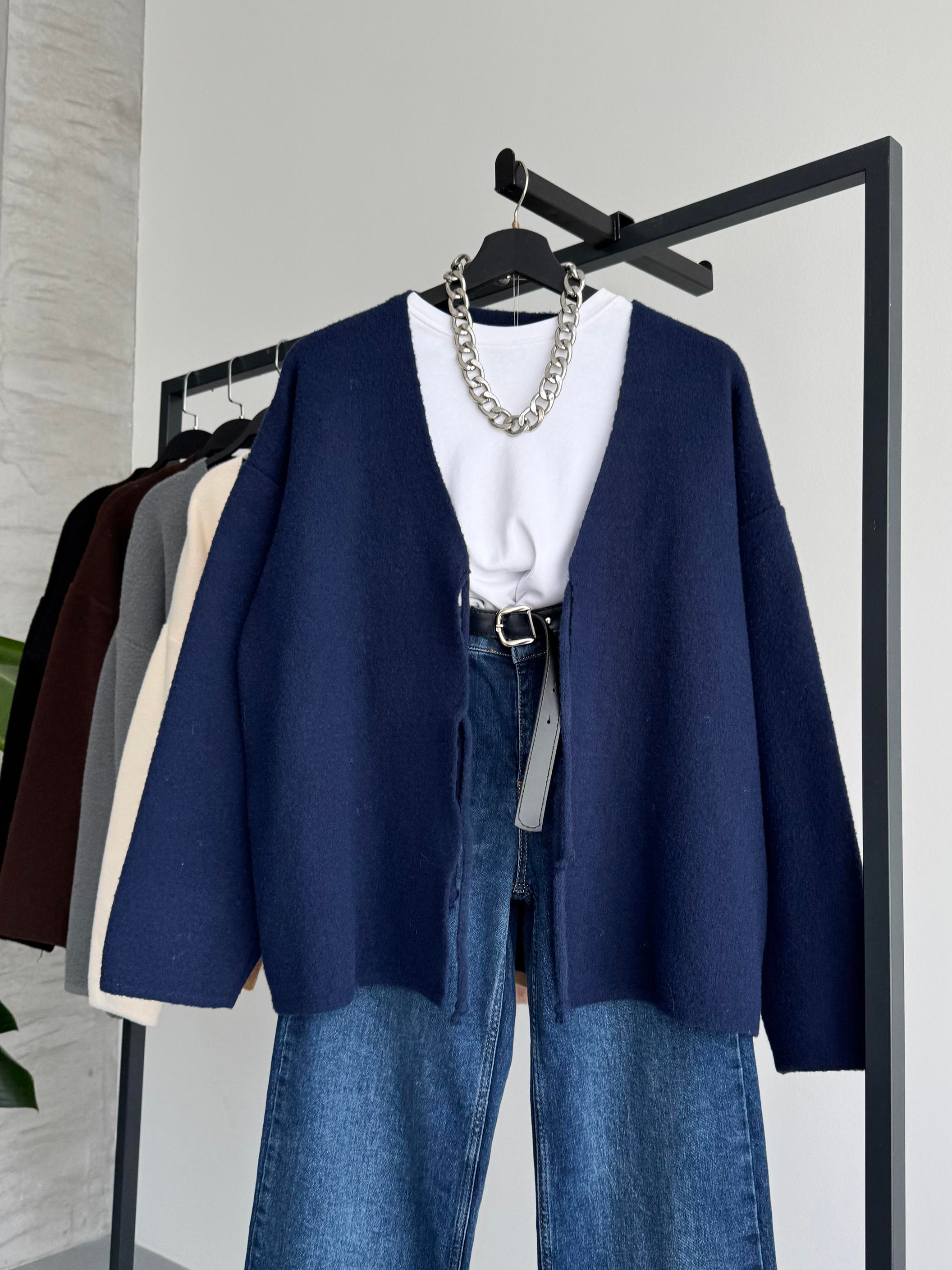 Ürün Detayları: Önden bağlamalı, oversize kesim. Yumuşak dokulu triko karışımlı kumaş. Hafif ve rahat kullanım. Düğmesiz