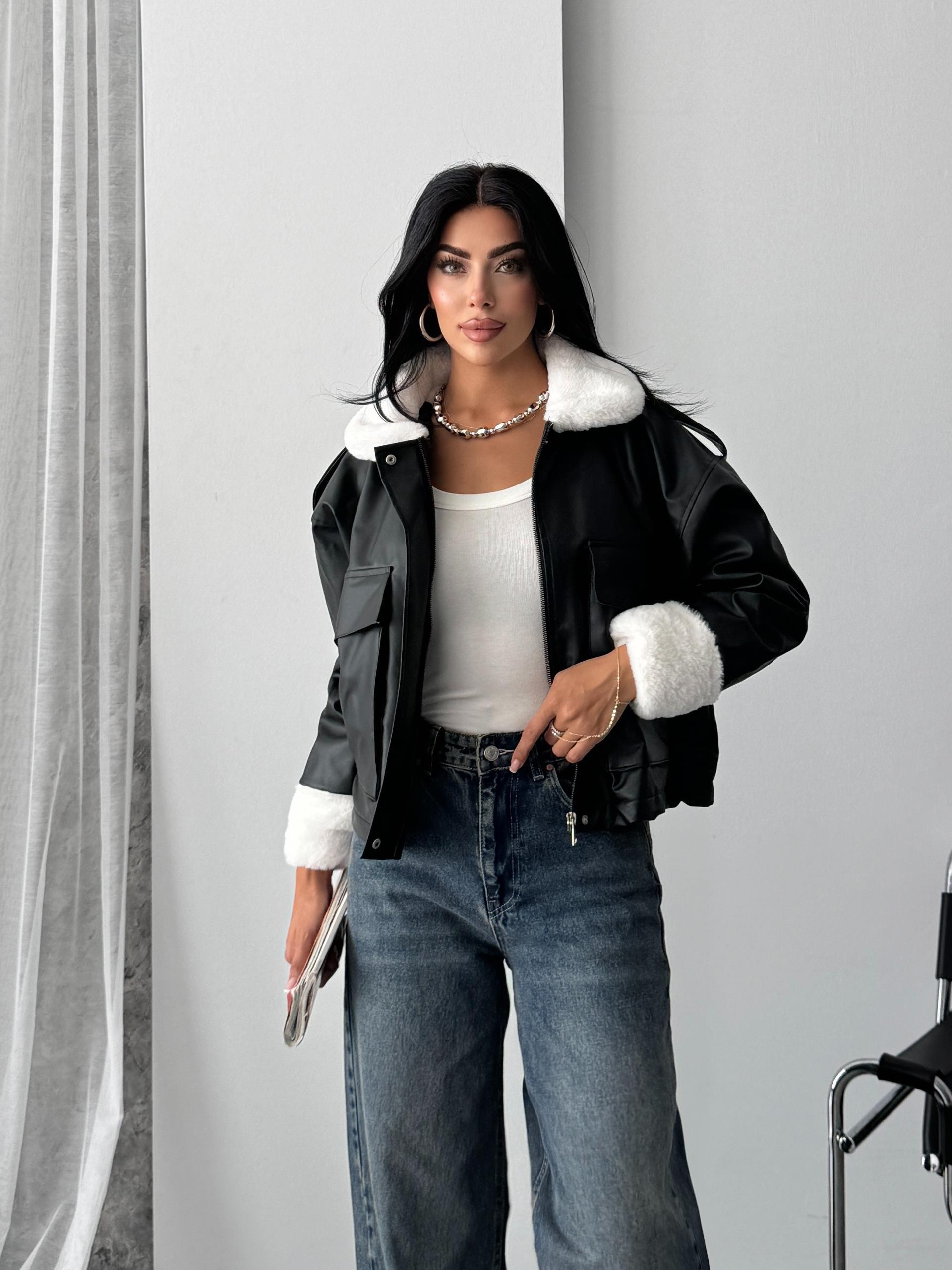 Beyaz Kürk Yakalı Siyah Deri Ceket