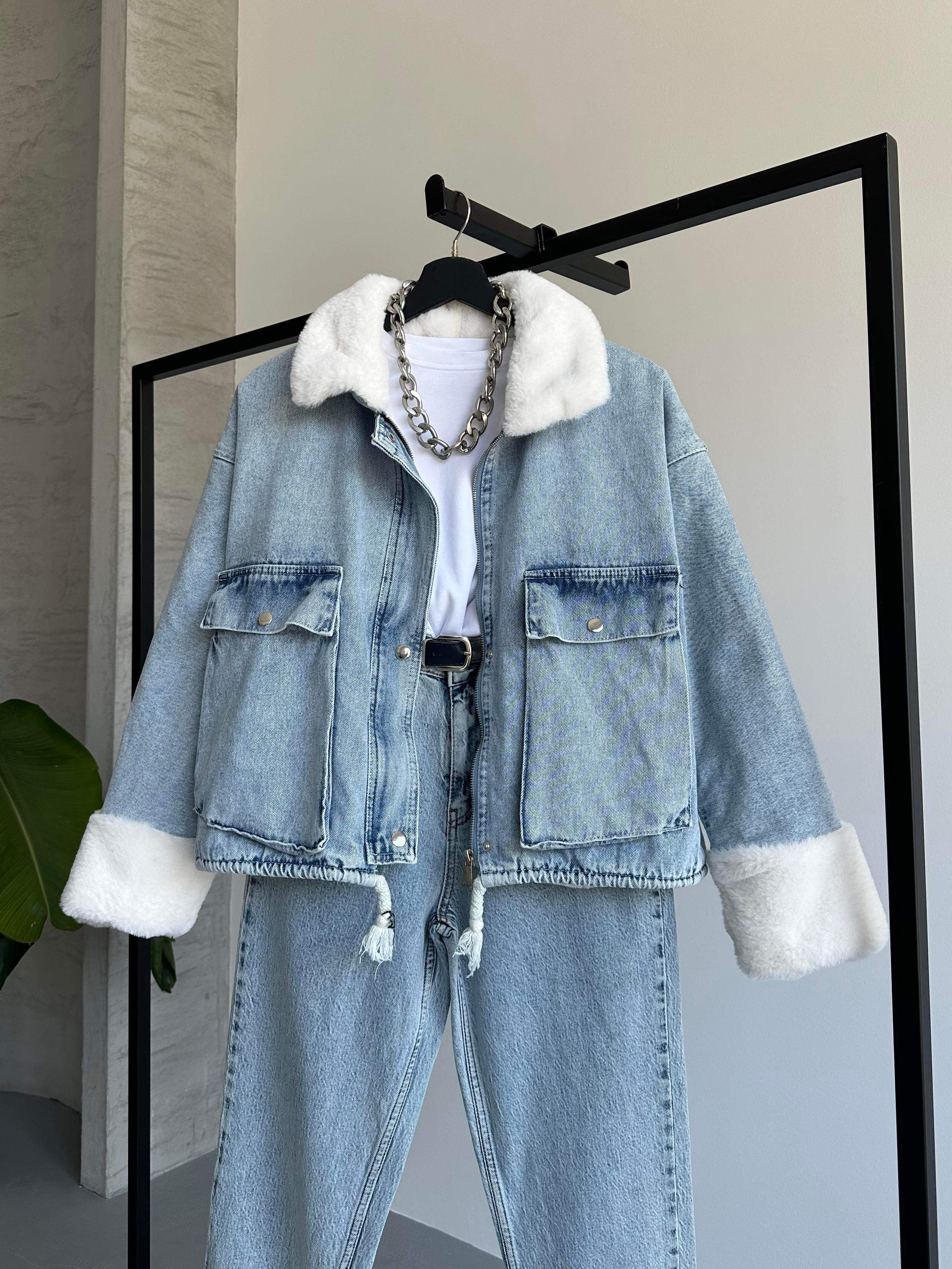Kış aylarında tarzından ödün vermek istemeyenler için mükemmel bir seçenek! Bu oversize denim ceket, beyaz yumuşacık kürk detaylarıyla hem sıcak tutar hem de şıklığı yakalamanızı sağlar.