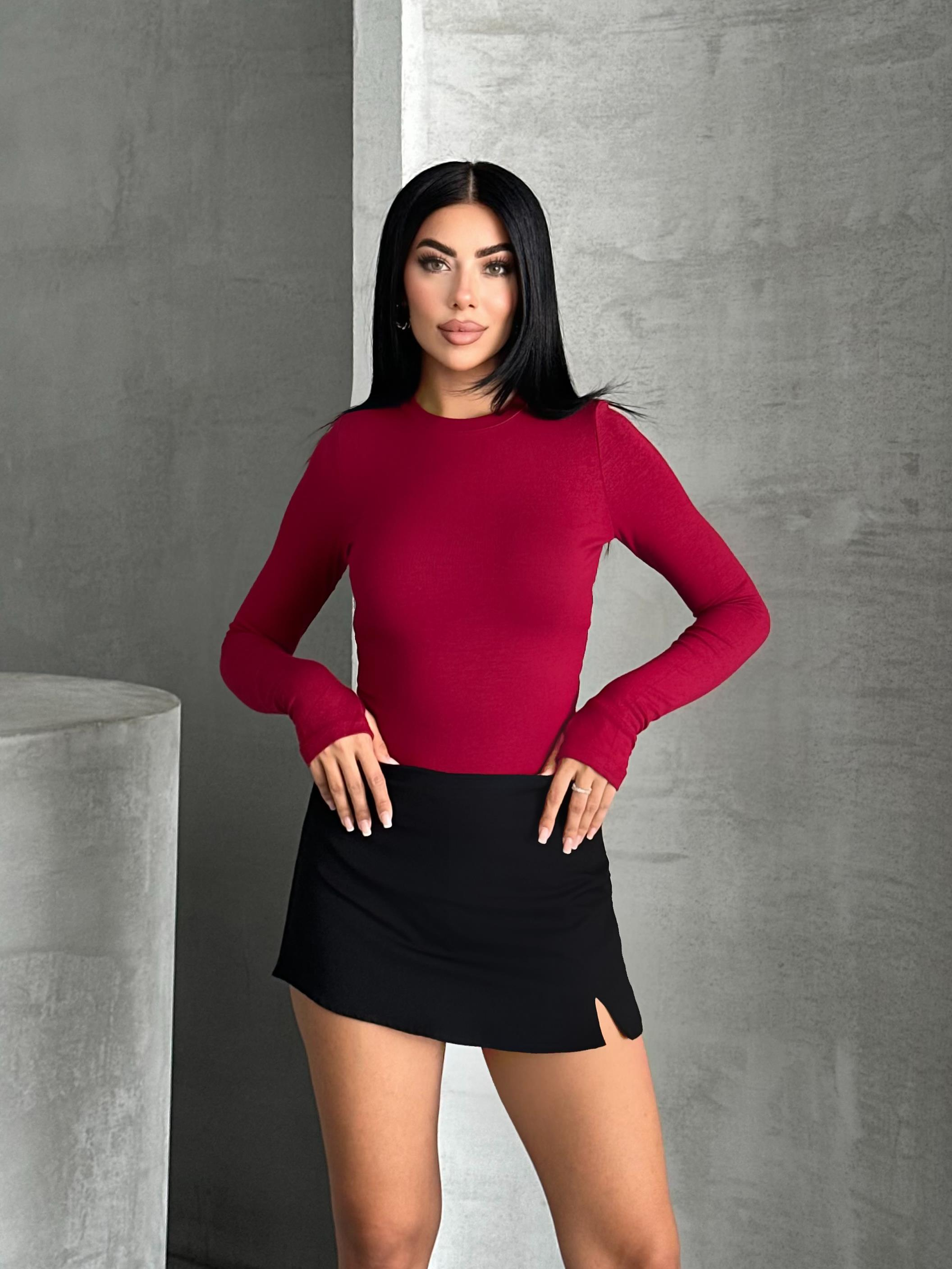 Bisiklet Yaka Parmak Geçmeli Bordo Bluz