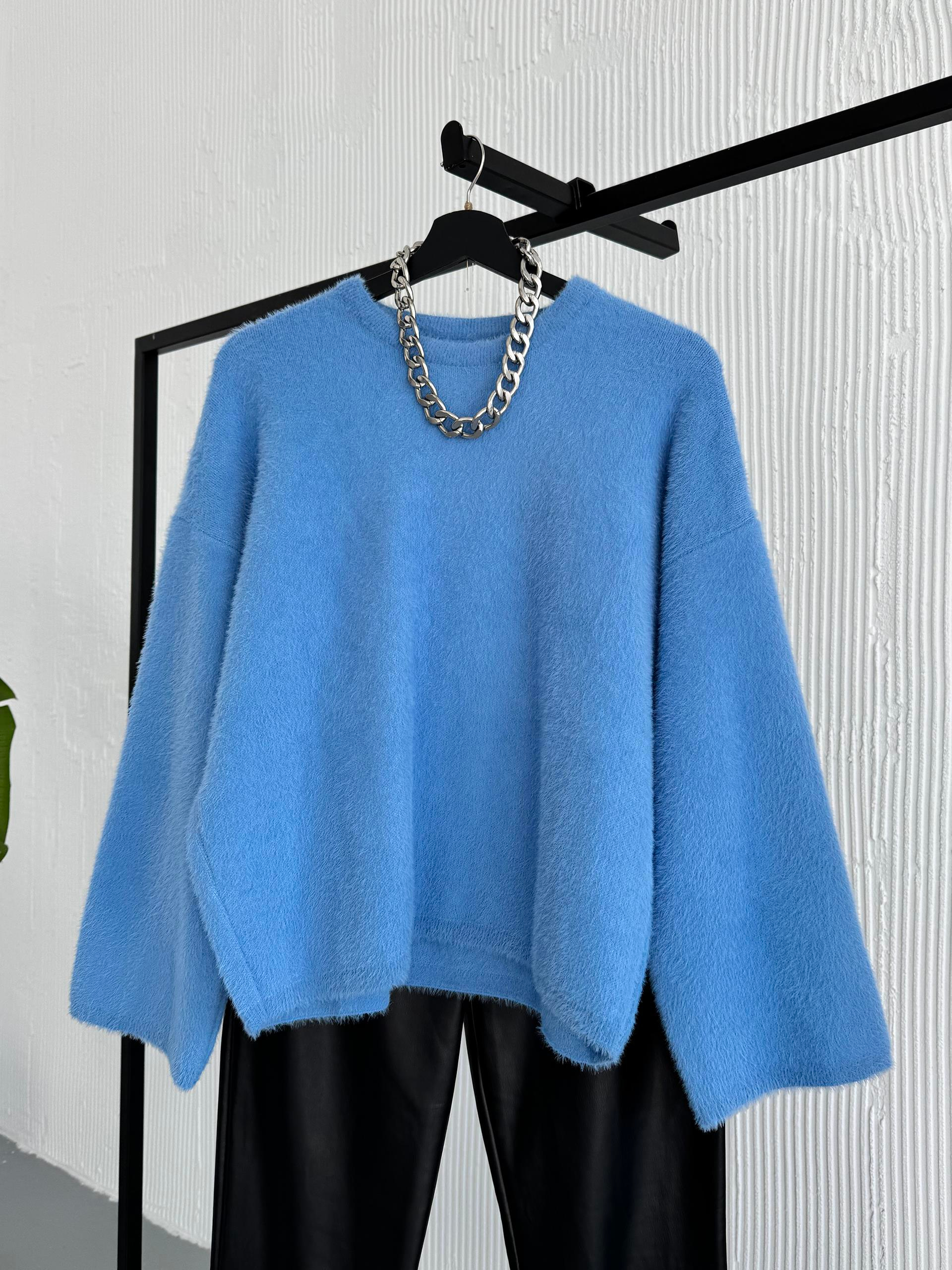Şıklık ve rahatlığı bir arada sunan Mavi oversize triko kazak, yumuşacık dokusu ile soğuk günlerde konforlu bir kullanım sağlar. Modern kesimi ve salaş görünümüyle günlük kombinlerinize hem spor hem de şık bir dokunuş katar