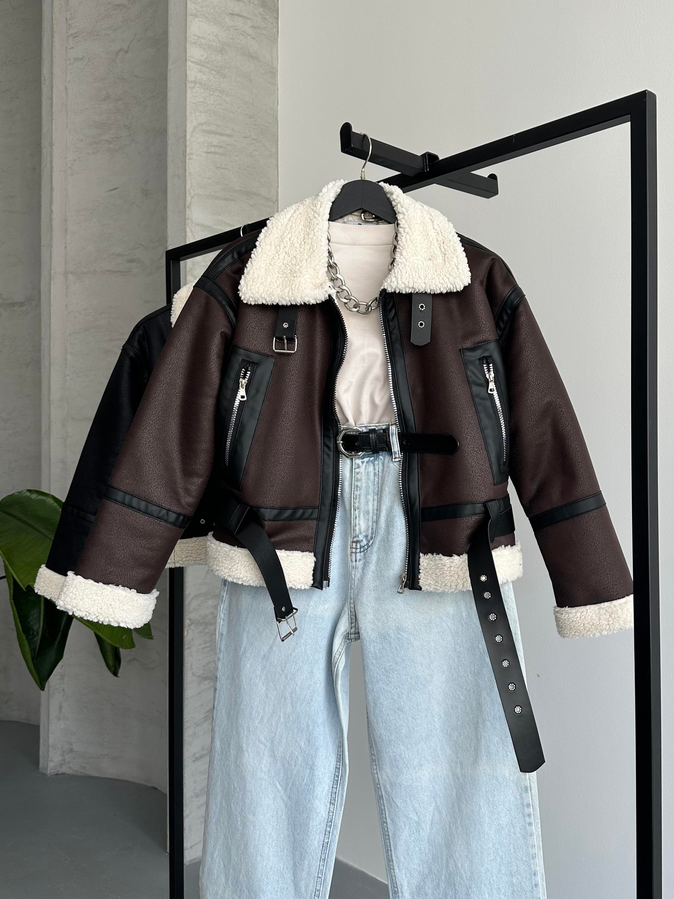 Soğuk havalarda tarzınızdan ödün vermeyin! Modern çizgileri ve rahat kalıbıyla dikkat çeken bu Acı Kahve suni deri biker ceket, peluş yaka ve manşet detaylarıyla sezonun favori parçaları arasında yerini alıyor.
