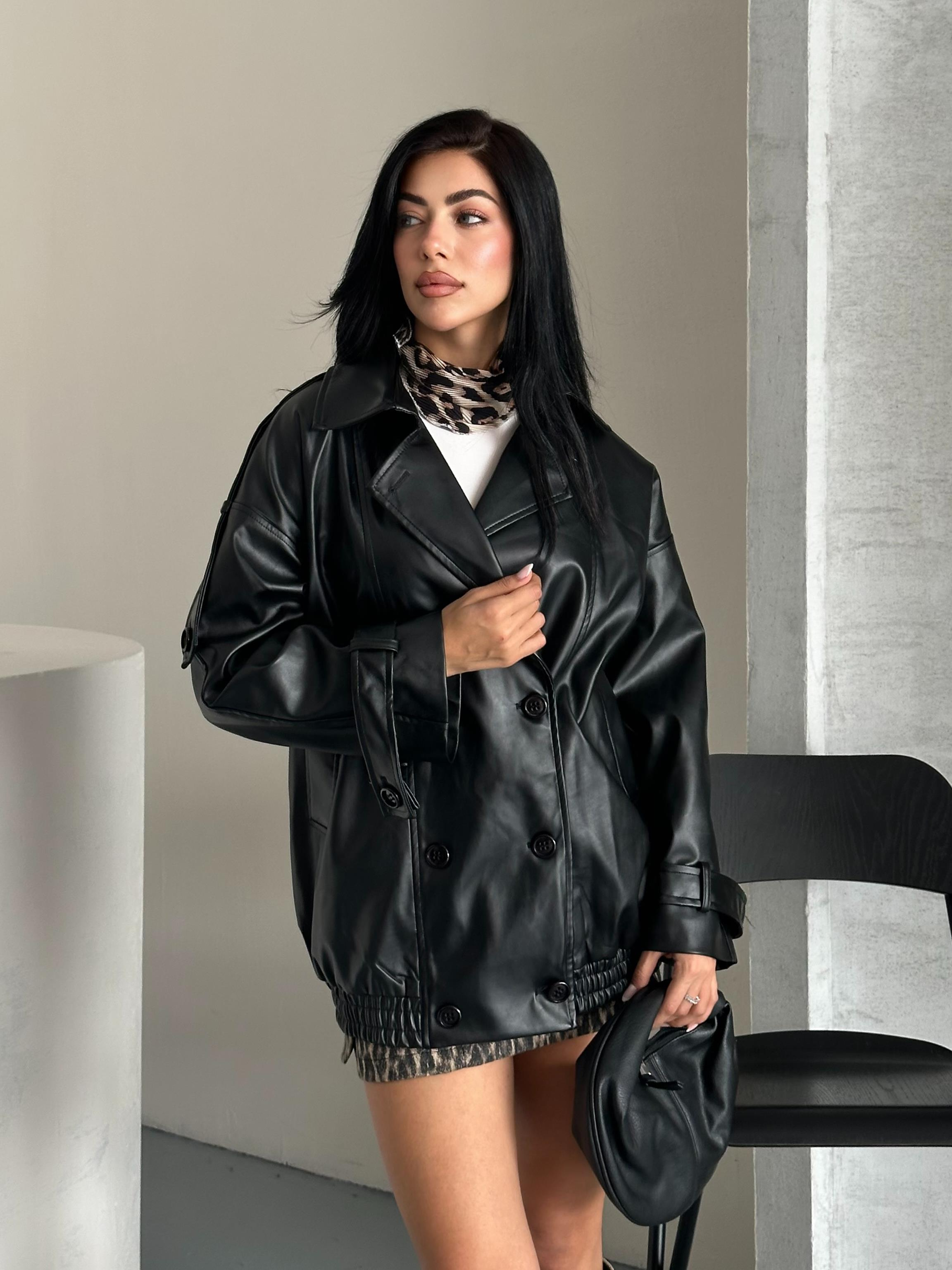 Oversize kesimiyle modern bir duruş sunan siyah deri görünümlü mont, sezonun en trend dış giyim parçalarından biri. Yumuşak dokusu, astarlı yapısı ve rahat kalıbıyla hem gündüz hem akşam kombinlerinde fark yaratır. Şıklığı ve konforu bir araya getiren bu parça, deri sevenlerin dolabında mutlaka yer almalı.
