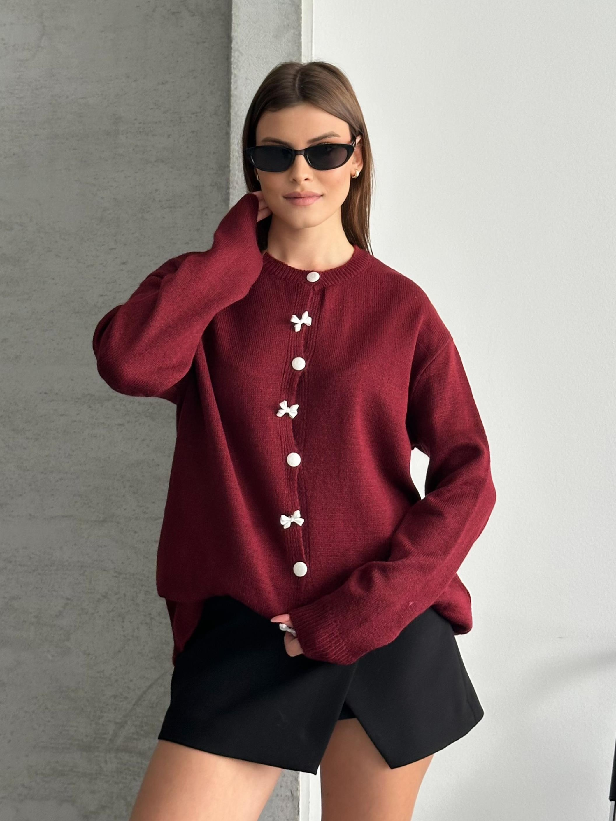Fiyonklu Düğmeli Bordo Triko Hırka