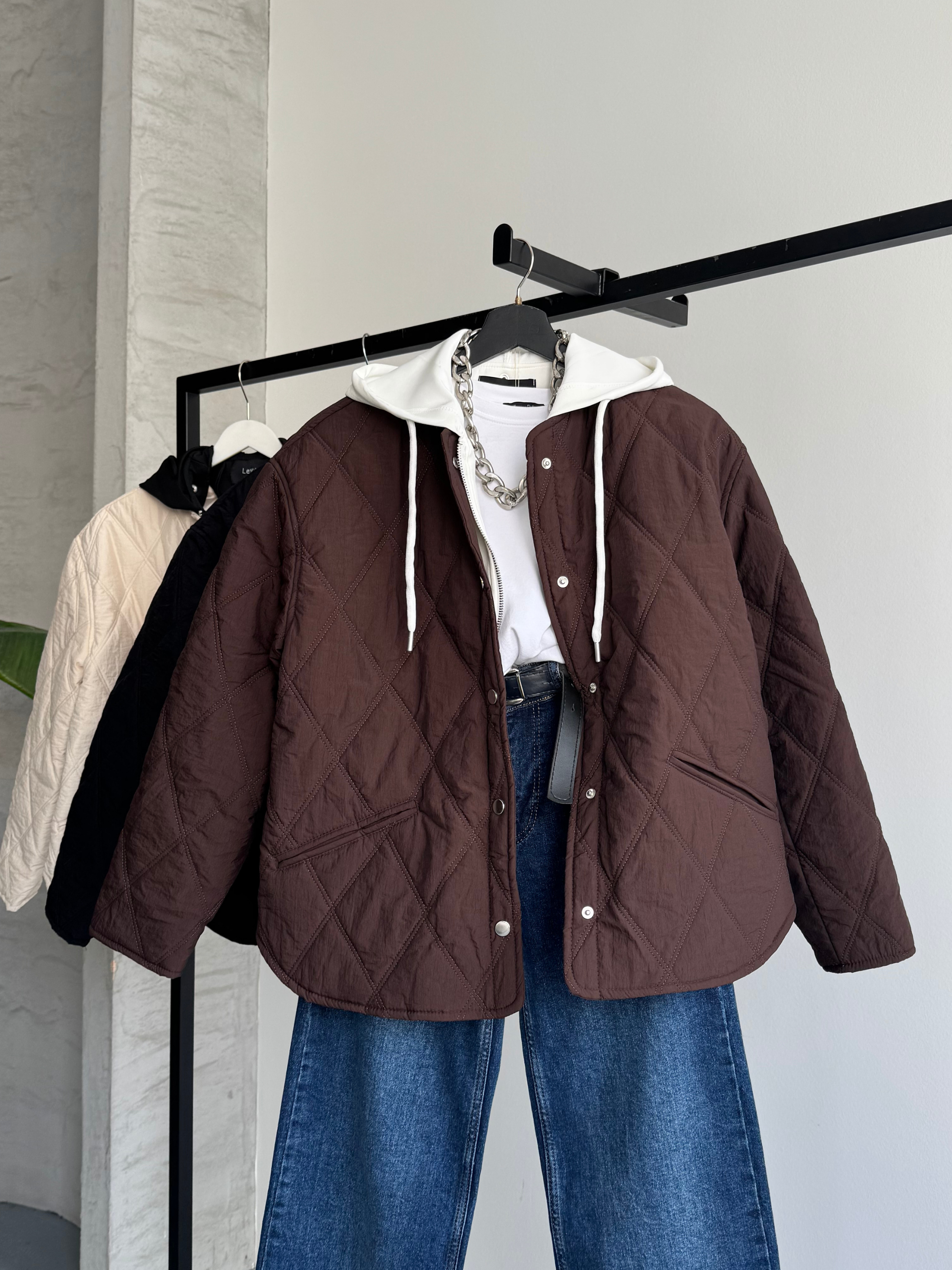 Bahar ve kış aylarının vazgeçilmezi olan bu kahverengi kapüşonlu kapitone ceket, şıklığınızı ve sıcaklığınızı bir arada sunuyor. Hem spor hem şık kombinler için ideal!