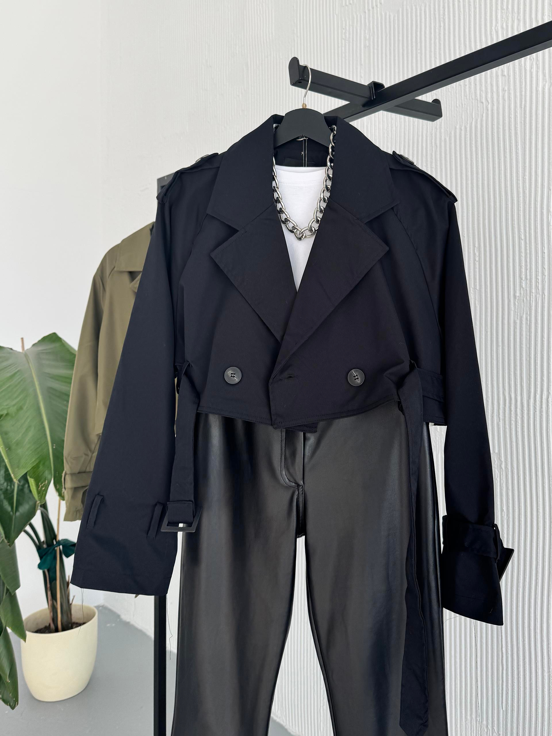 Kruvaze Kesim Crop Kemerli Siyah Trençkot