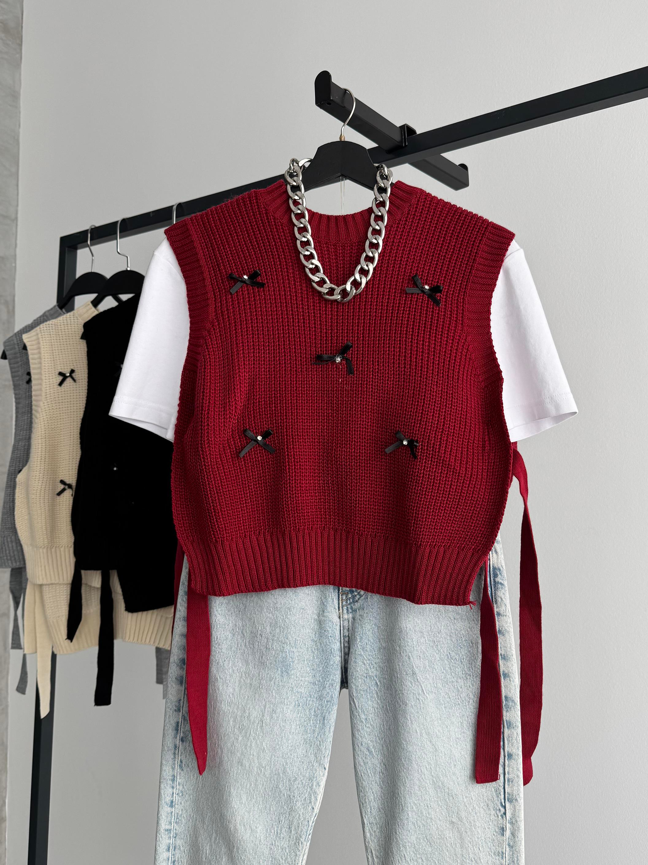 Modern ve iddialı görünümüyle öne çıkan yan bağcıklı örgü triko yelek, şıklığı günlük stile taşıyor. Canlı kırmızı rengiyle dikkat çekerken, yan kısımlardaki bağcık detayları sayesinde farklı bedenlere uyum sağlar.
