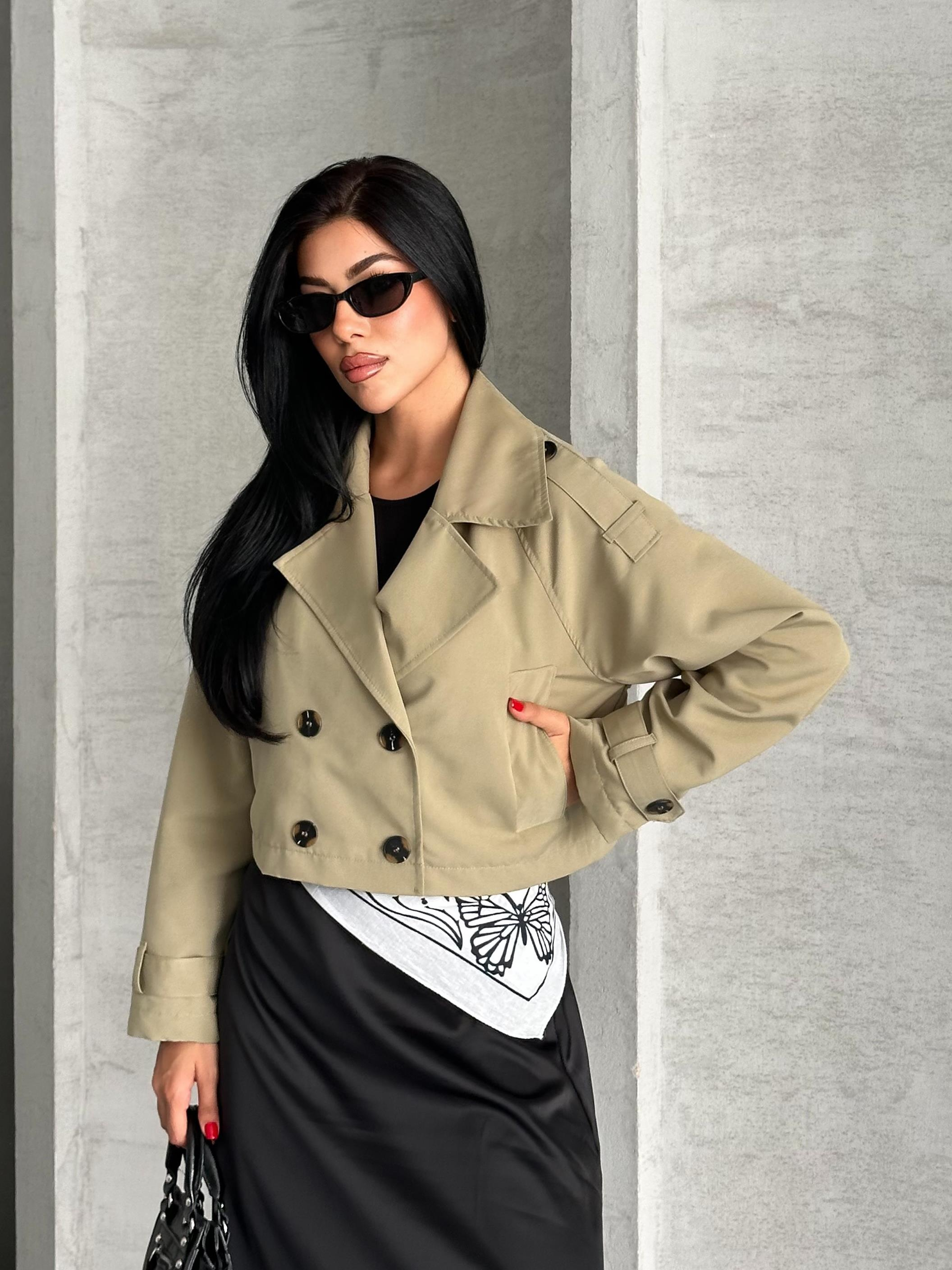 Modern ve şık tasarımıyla dikkat çeken kısa trençkot ceket, bahar ve sonbahar aylarında kurtarıcı parça olacak. Oversize kesimi sayesinde rahat hareket imkânı sunarken, kruvaze düğmeli ön tasarımıyla zamansız bir stil kazandırır.