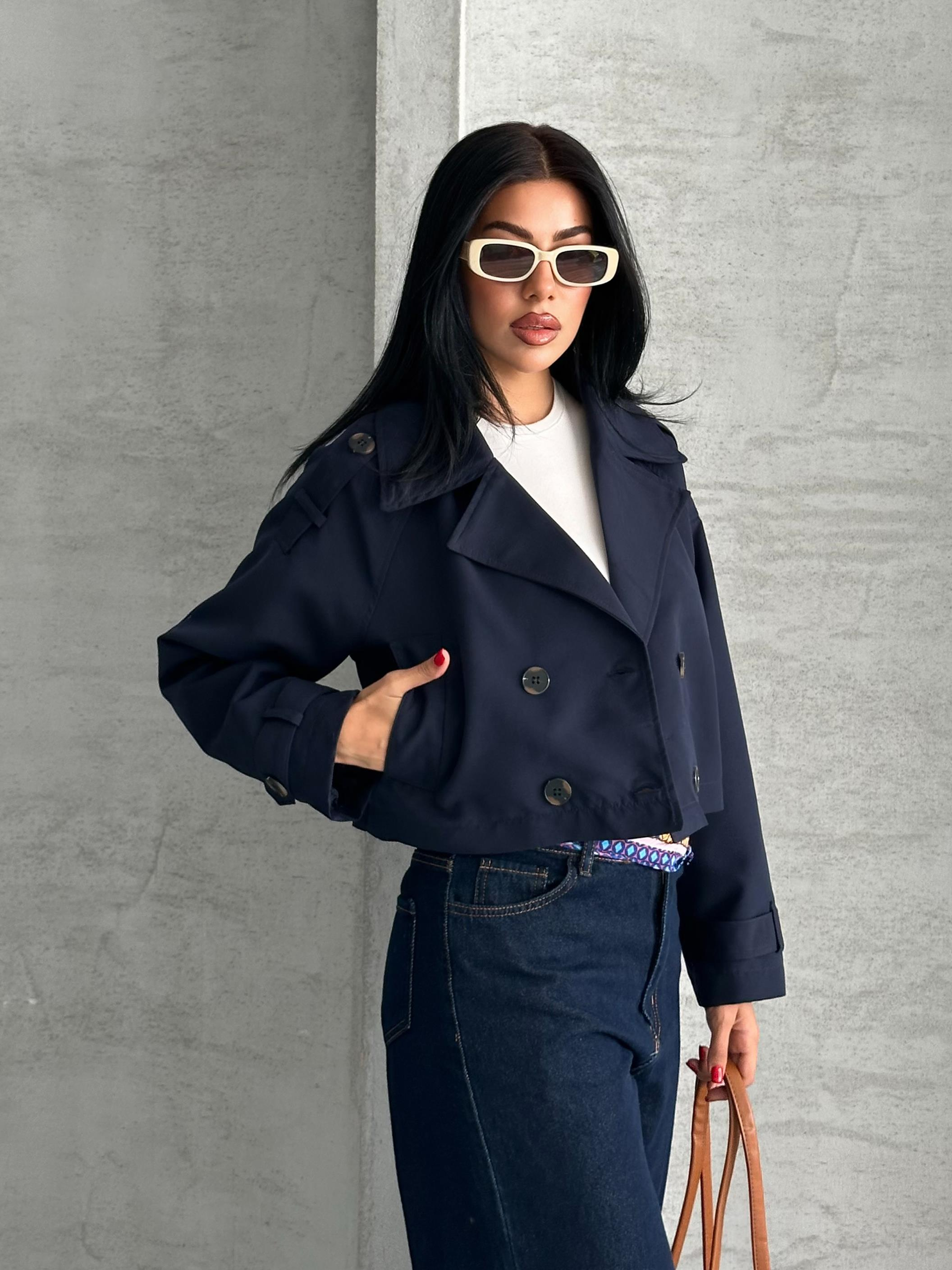 Modern ve şık tasarımıyla dikkat çeken kısa trençkot ceket, bahar ve sonbahar aylarında kurtarıcı parça olacak. Oversize kesimi sayesinde rahat hareket imkânı sunarken, kruvaze düğmeli ön tasarımıyla zamansız bir stil kazandırır.