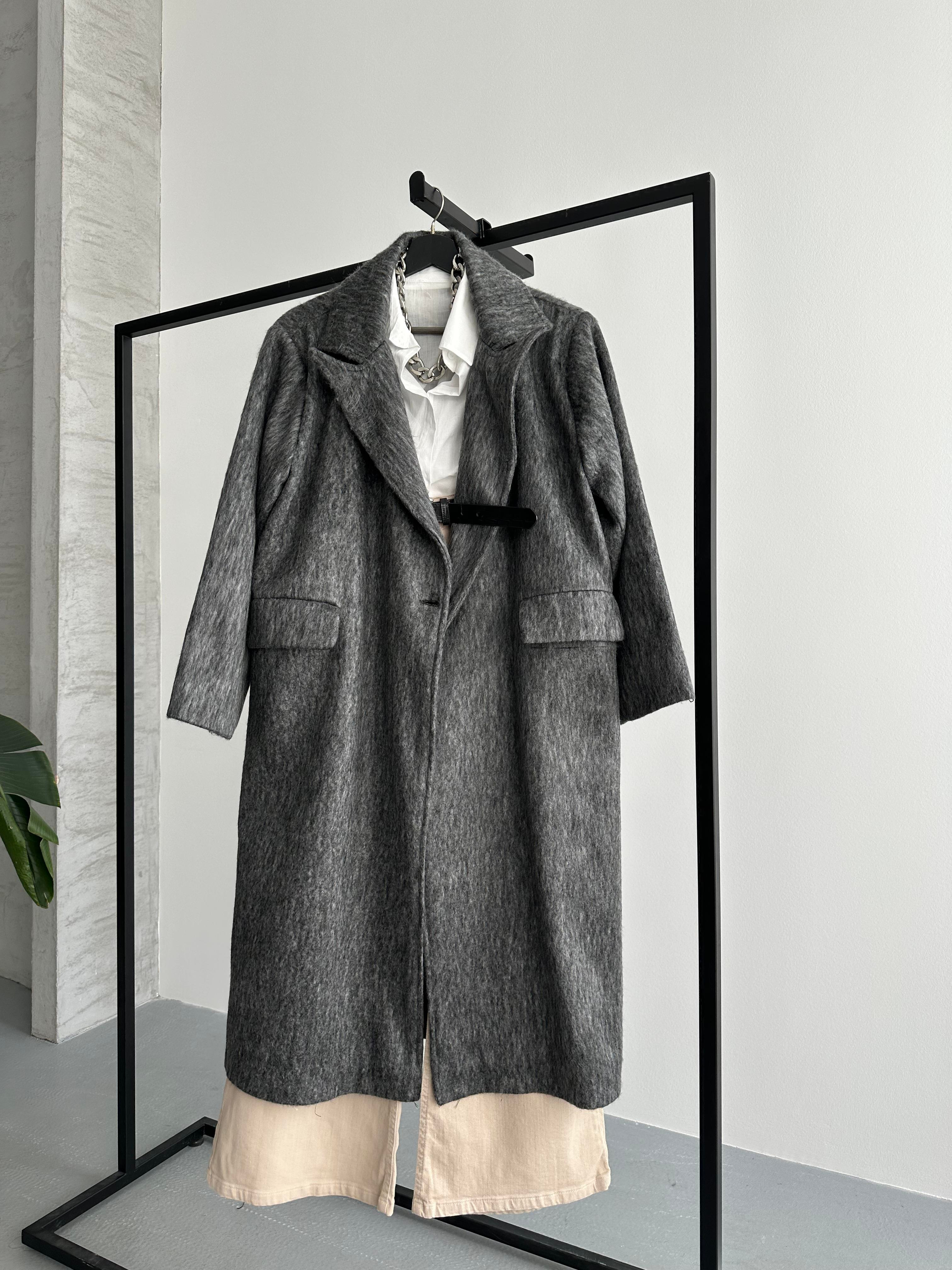 Tek Düğmeli Oversize Antrasit Yün Kaban