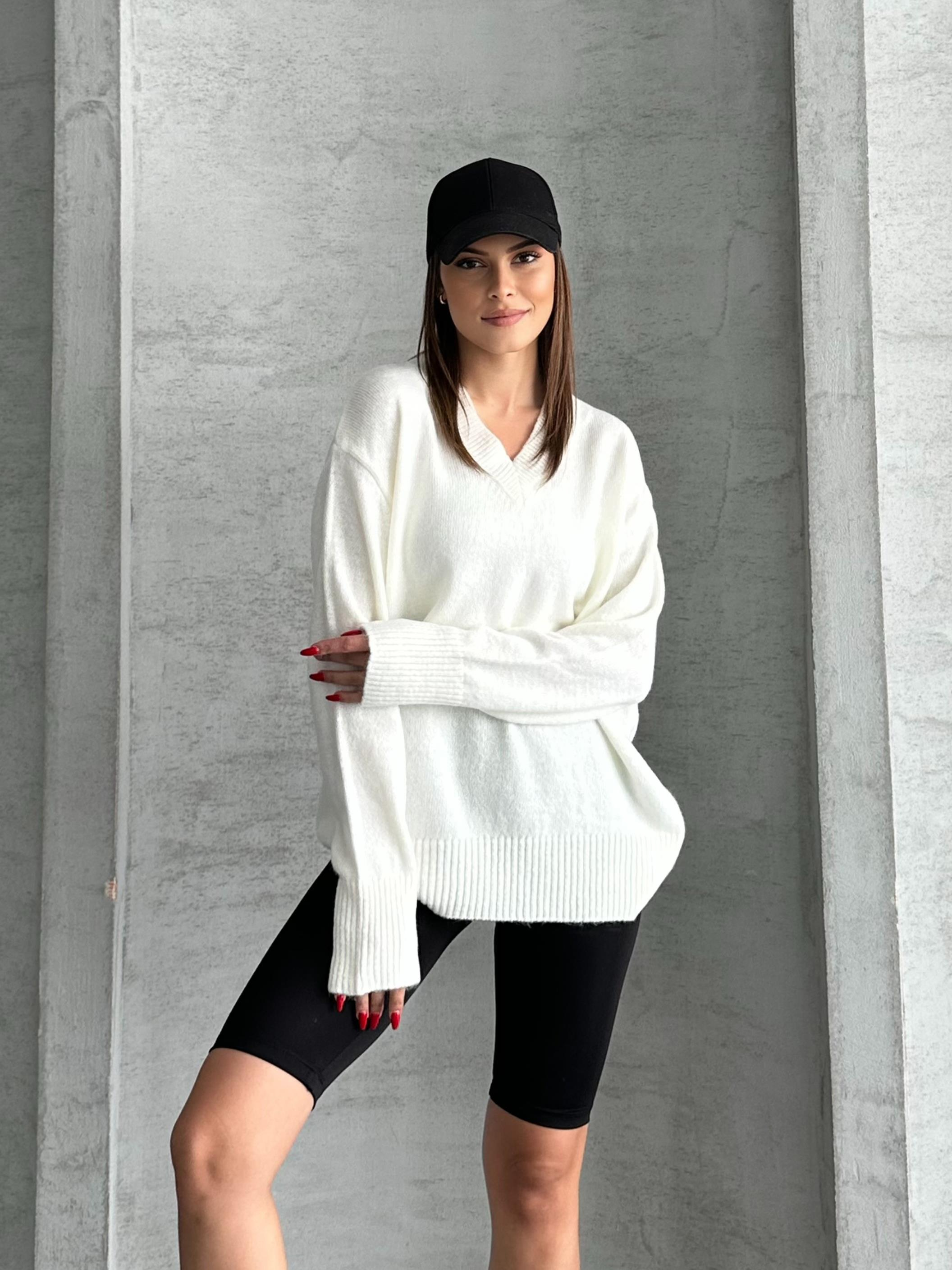 Sade şıklığın en konforlu hali! Beyaz oversize triko kazak, yumuşacık dokusu ve dökümlü formuyla hem tarzını hem rahatlığını ön plana çıkarıyor.