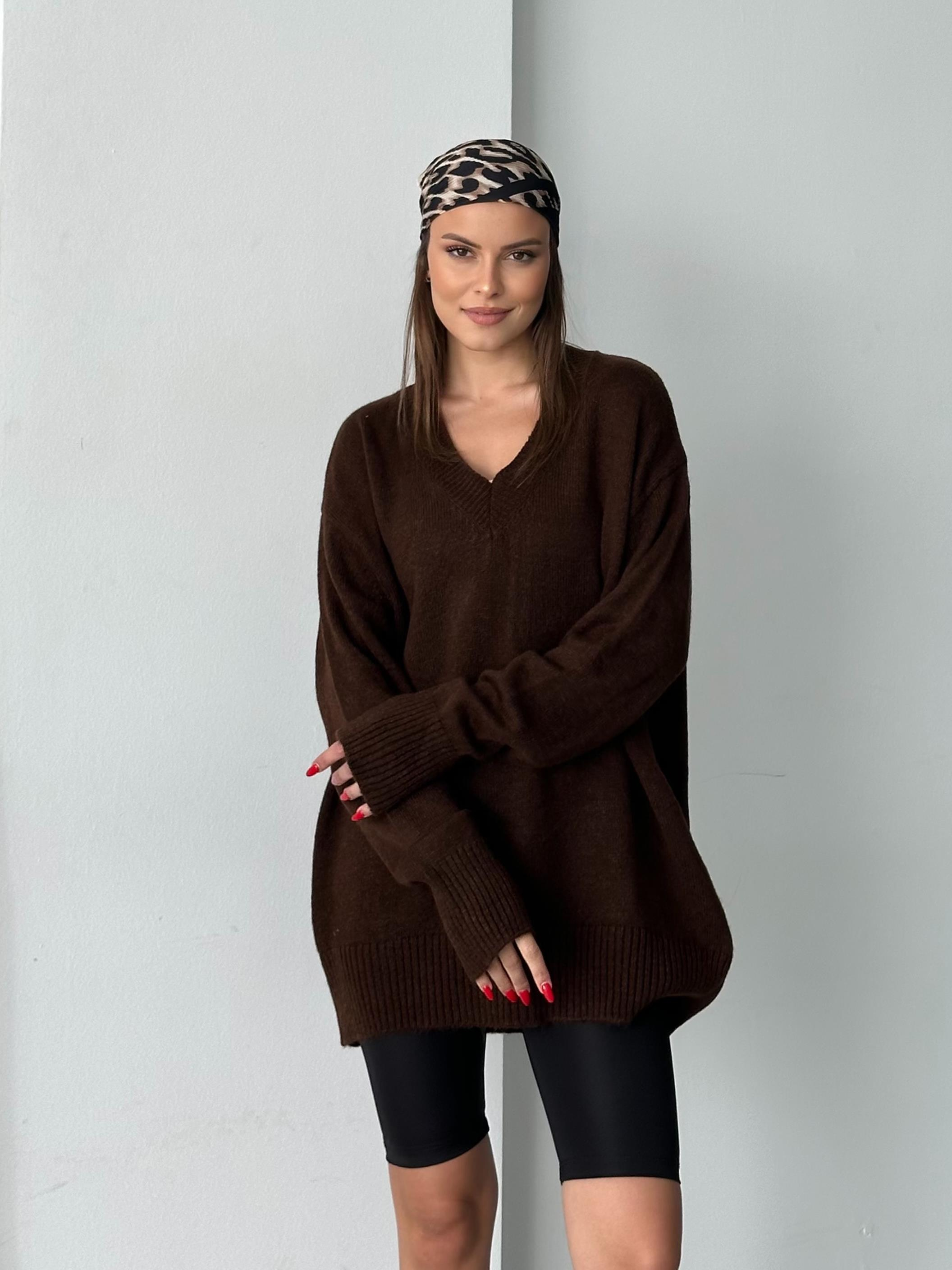 Sade şıklığın en konforlu hali! Kahverengi oversize triko kazak, yumuşacık dokusu ve dökümlü formuyla hem tarzını hem rahatlığını ön plana çıkarıyor.