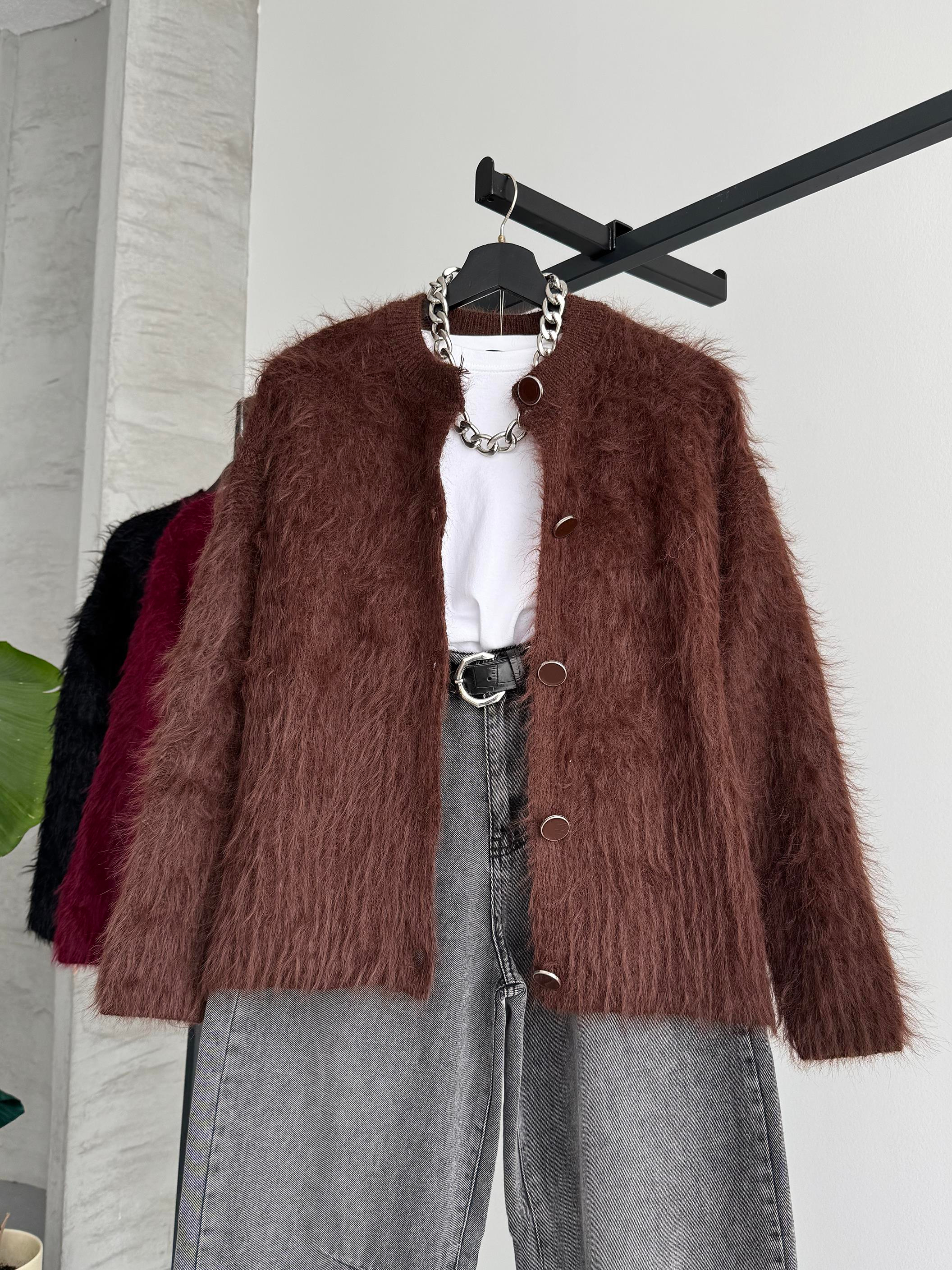 Soğuk kış günlerinde hem şık hem de sıcak tutacak bir parça arıyorsanız, Kahverengi tüylü düğmeli hırka tam size göre! Yumuşacık ve kabarık dokusuyla modern bir görünüm sunarken, oversize kesimiyle rahatlığı ön planda tutar. Ön kısmındaki düğme detayları sayesinde ister açık ister kapalı şekilde kullanabilir