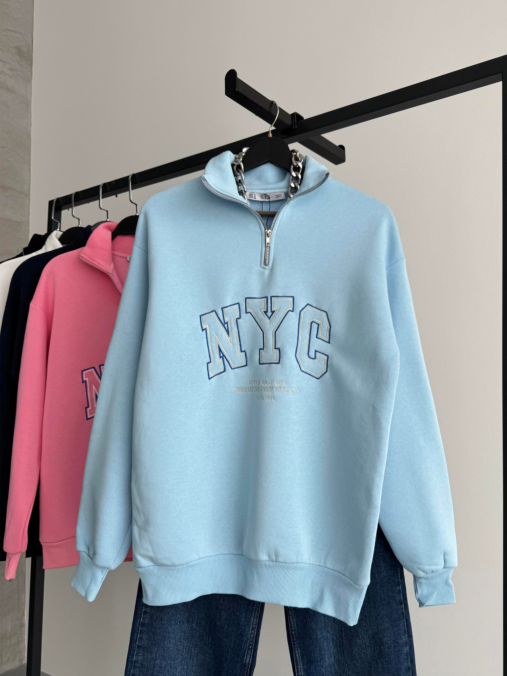 Şehir stiline ilham veren bu NYC yazılı Mavi yarım fermuarlı sweatshirt, hem şıklığı hem de konforu bir arada sunar. Oversize kalıbı sayesinde gün boyu rahat bir kullanım sağlarken, modern tasarımıyla sokak stilinize trend bir dokunuş katar. Manhattan ruhunu gardırobuna taşımak isteyenler için ideal bir parça!