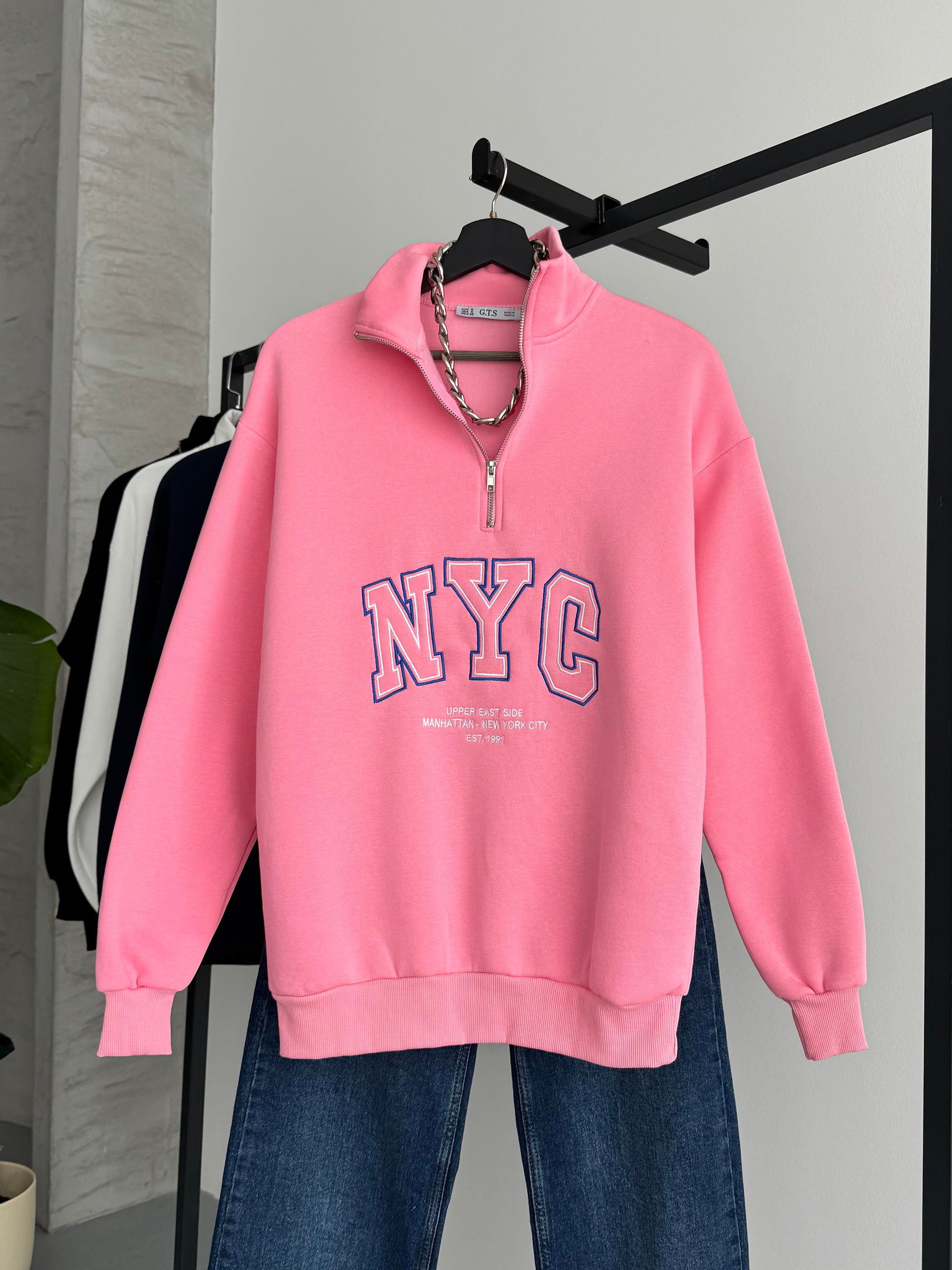 Şehir stiline ilham veren bu NYC yazılı Pembe yarım fermuarlı sweatshirt, hem şıklığı hem de konforu bir arada sunar. Oversize kalıbı sayesinde gün boyu rahat bir kullanım sağlarken, modern tasarımıyla sokak stilinize trend bir dokunuş katar. Manhattan ruhunu gardırobuna taşımak isteyenler için ideal bir parça!