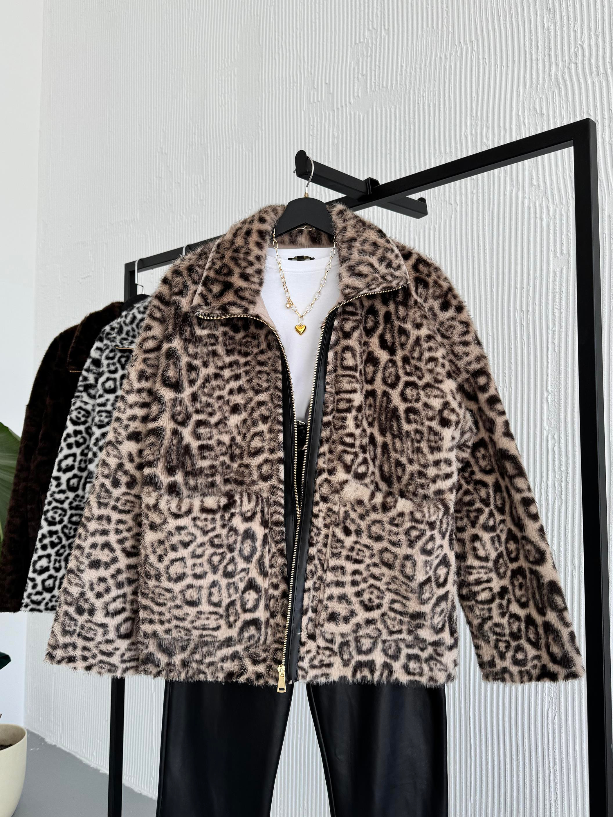 Vizon Leopar Desenli Fermuarlı Peluş Ceket