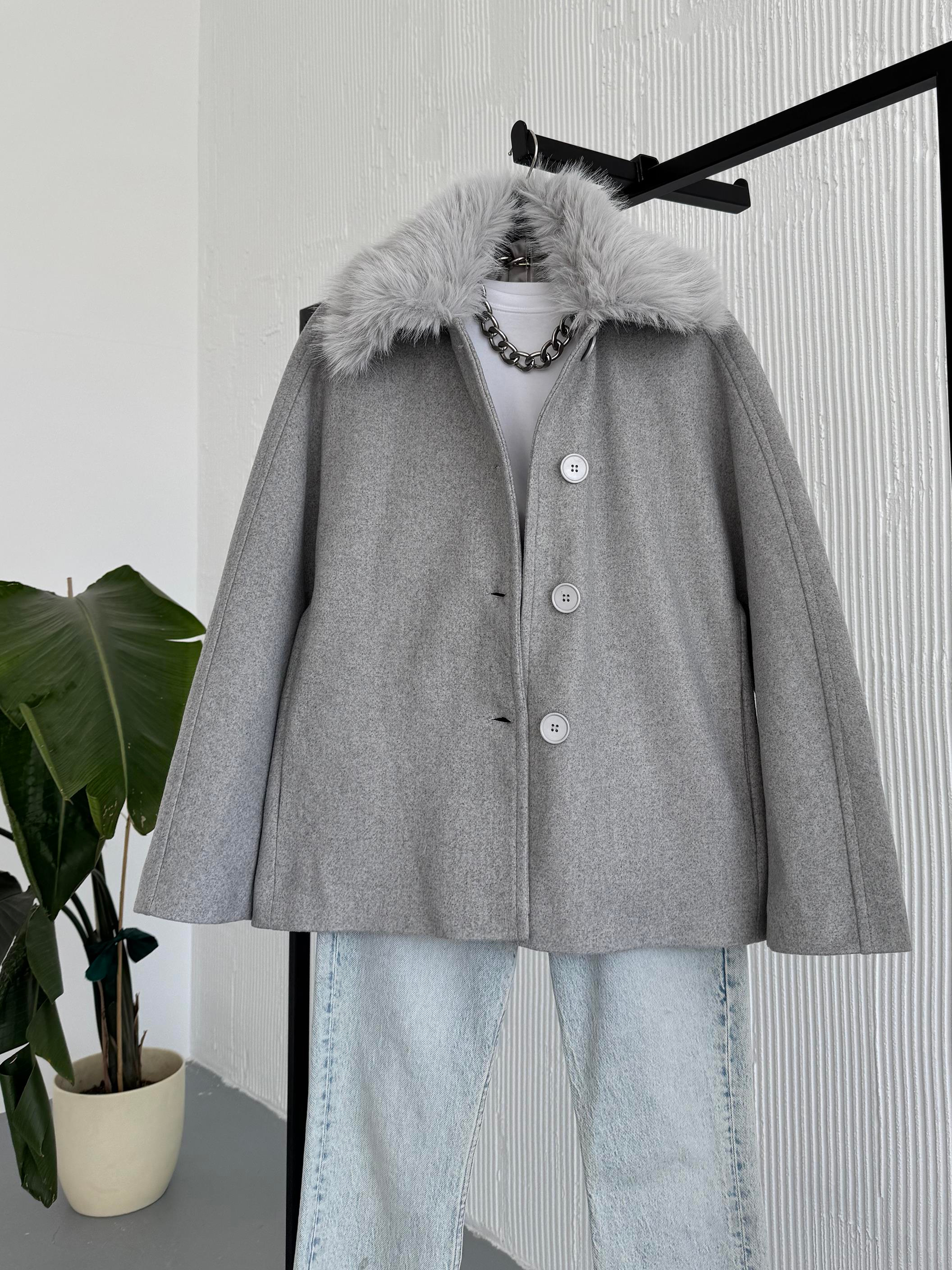 Ürün Detayları: Yakası kürklü, Önü Düğmeli. Kalın kaşe kumaş. Düşük Omuzlu. Astarlı. Çift cepli.