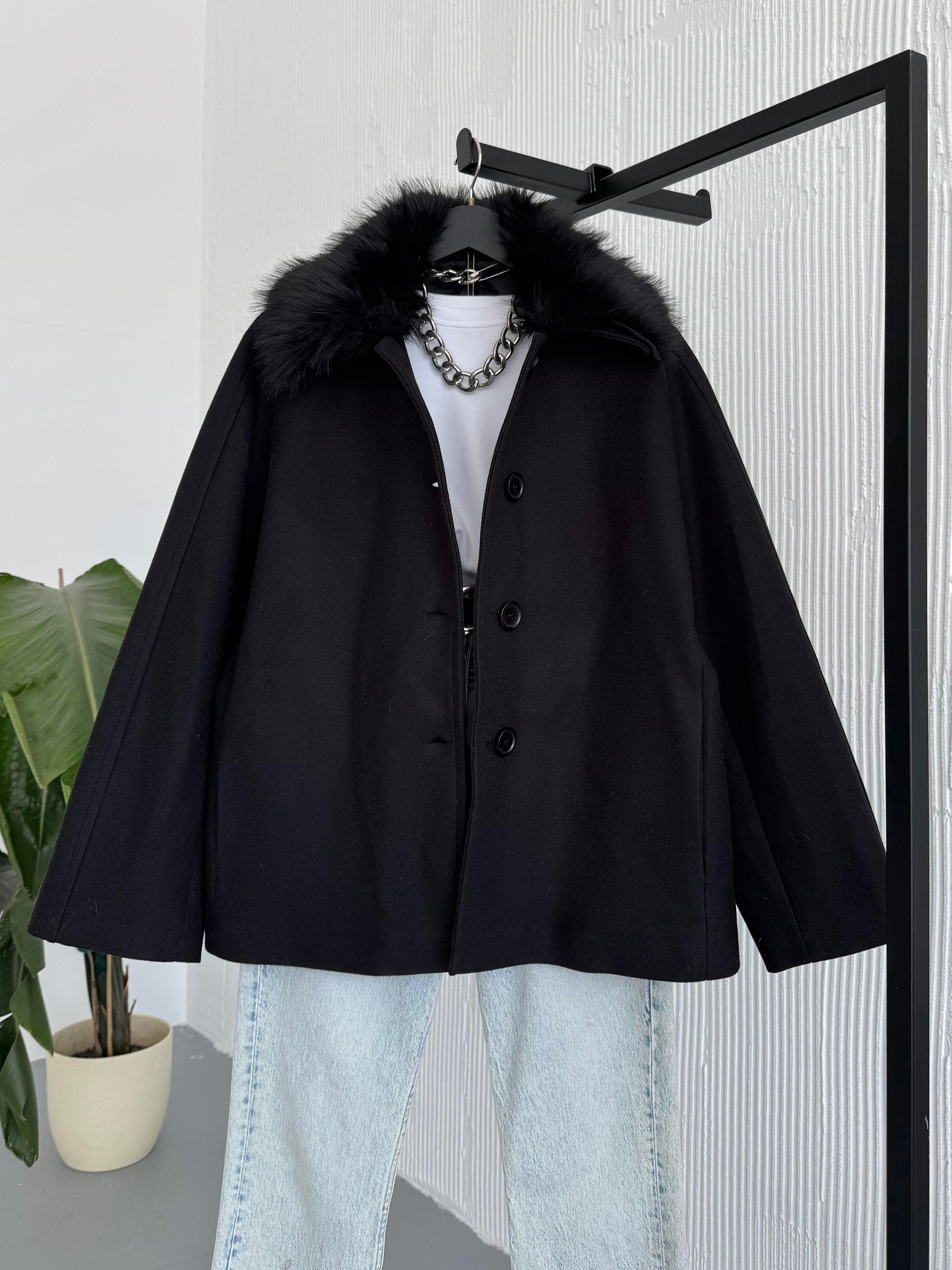 Ürün Detayları: Yakası kürklü, Önü Düğmeli. Kalın kaşe kumaş. Düşük Omuzlu. Astarlı. Çift cepli.